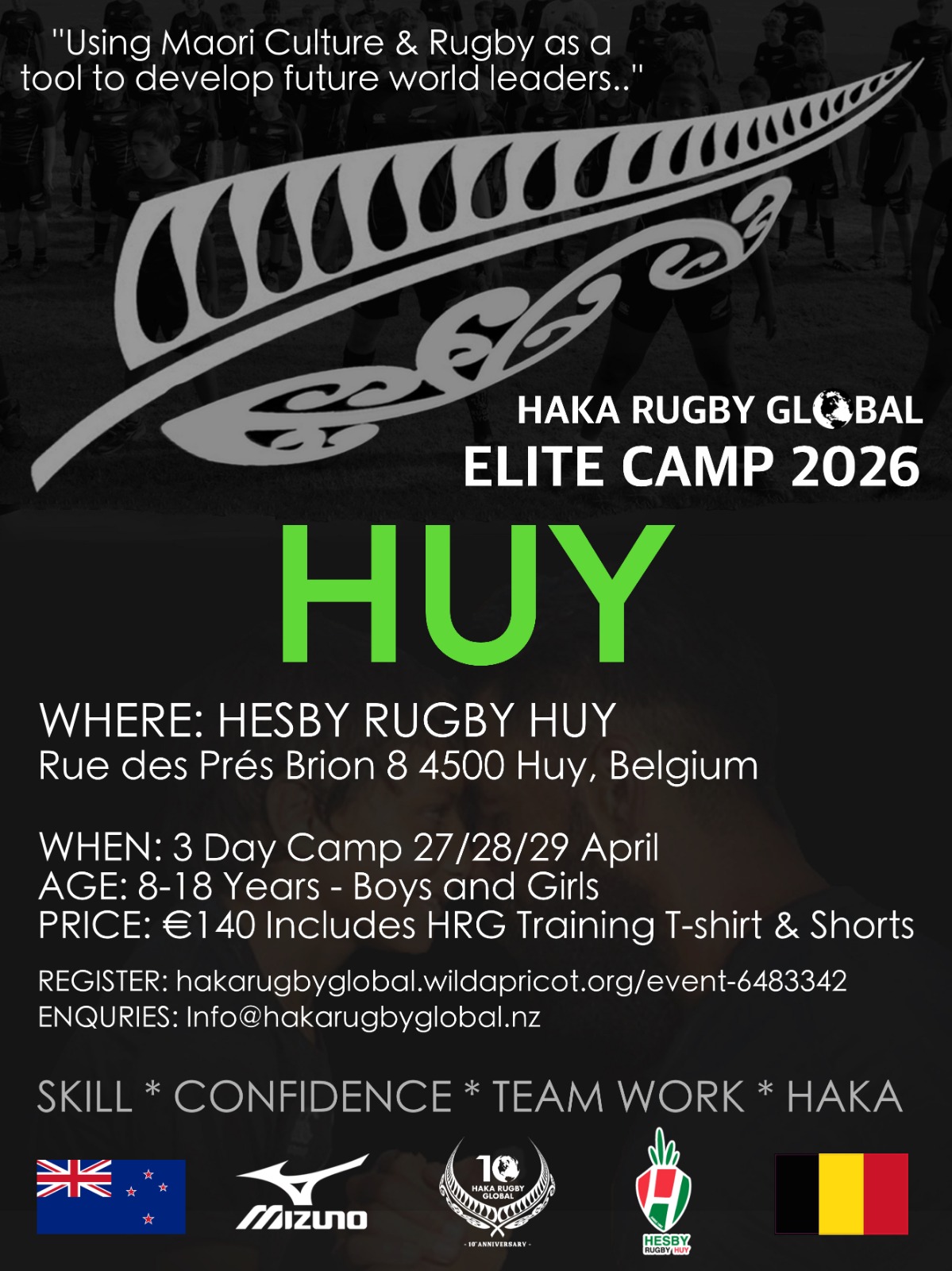 Nous sommes heureux d’annoncer le retour du stage HAKA Rugby Global à Huy les 27, 28 et 29 avril 2026. Cet événement de référence propose une immersion unique dans la culture du rugby néo‑zélandais, reconnue pour son exigence, son intensité et ses valeurs fortes.